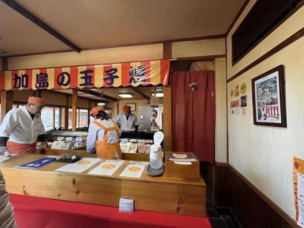 店内に入ると、一段高い台の上で焼き手の方がリズムよく生地を流し込み、丁寧に返しながら焼き上げる姿が見えます。大きな鉄板の上で次々と玉子焼きが生まれていく様子は見ていて飽きず、長年愛されてきた理由が伝わってきます。