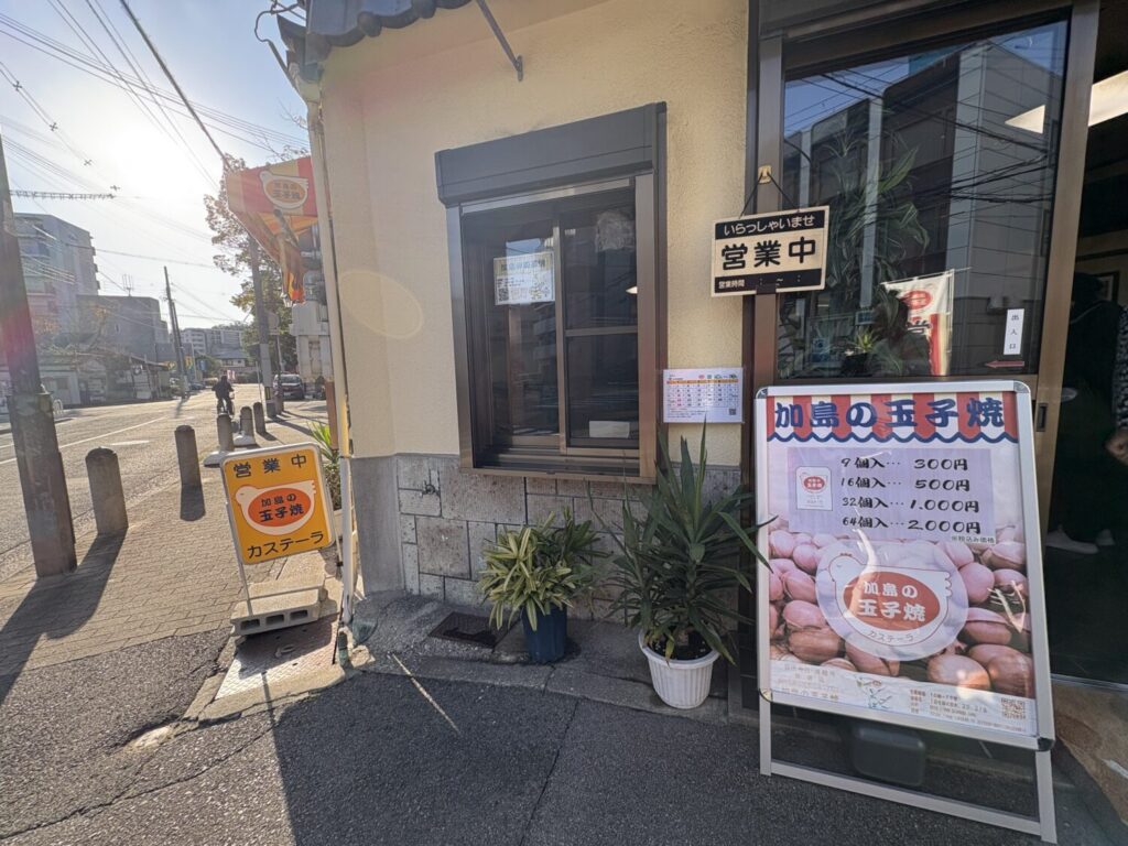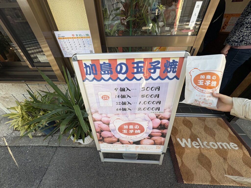 長田神社の参道を歩いていると、赤と黄色のテントが目に留まります。その下で昔ながらの手焼きカステラを販売しているのが「加島の玉子焼き」。地元ではおなじみの店で、お祭りや初詣の時期には多くの人が訪れ、長田の風景として完全に溶け込んでいます。