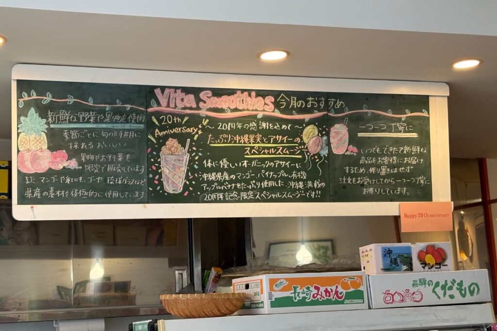 この「20周年Anniversaryスペシャルスムージー」は、沖縄の果実をたっぷり詰め込んでいて、本当に美味しいです。20年分の想いも詰まっています。お客様にも大好評で、20種類以上あるスムージーの中で、今年1番よく売れています。来年は、ビタスムージーと名前を変えて店を代表する定番商品になる予定です。
