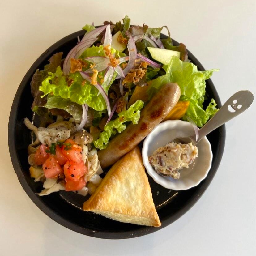 子どもの気持ちを思いやる優しい心から誕生した卵不使用のスコーン。カフェではモーニングプレートでもいただけます。「みっこの提案で、スコーンを食事メニューの一つとして提供するようにもなりました。アンチョビやキノコのマリネ、トマトをスコーンに乗せて食べるといった、私では考えつかないアイデアを出してくれます。それを調理師のかねやんが一つの料理として完成させてくれるんです。私が作るシンプルなスコーンを2人が彩ってくれています」