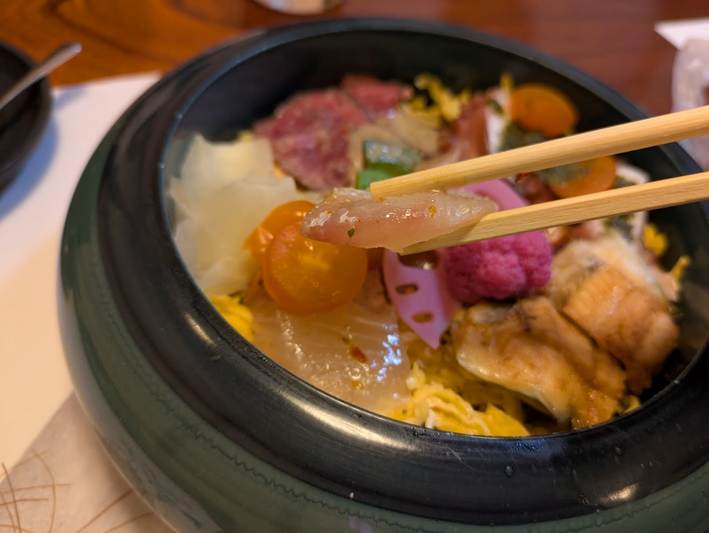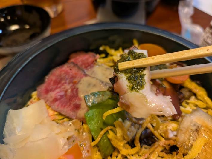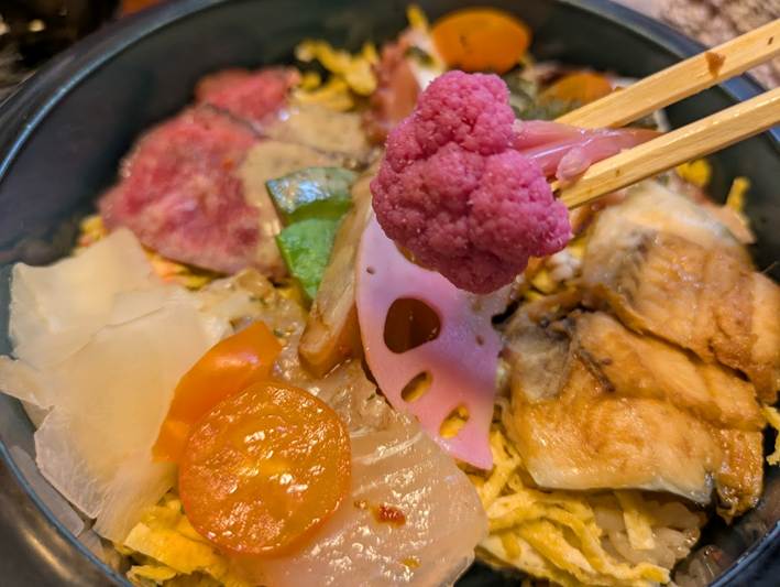 知多牛のローストビーフや紫ブロッコリーも使われ、通常の海鮮丼ではお目にかかれないようなカラフルな色合いが目にも楽しい逸品です。