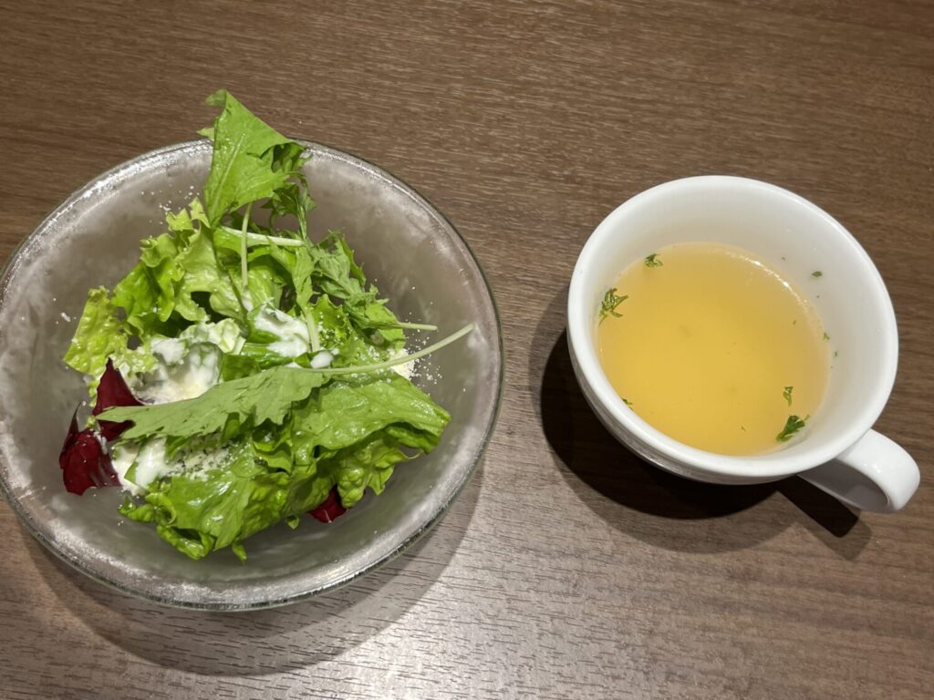 さっそくやってきたのはスープとサラダ。サラダはシンプルなグリーンサラダ。上にはパルメザンチーズがかかっています。さすがチーズのお店だけありますね。やっぱりチーズがおいしい。