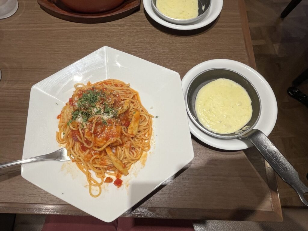 トマトスパゲッティーはおいしいトマトスパゲッティーだったのですが、残念ながらはちみつの味は感じられず。甘いトマトスパゲッティーというのも変な感じなので、もともと隠し味程度なのかもしれませんね。