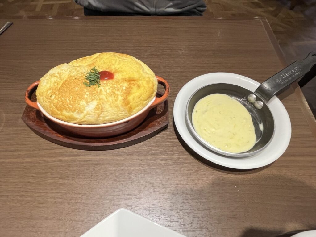 友人のモッツァレラチーズドリア~とろけるラクレットチーズ添えもやってきました。こちらもラクレットチーズは別添え。このスフレの食感が面白かった!