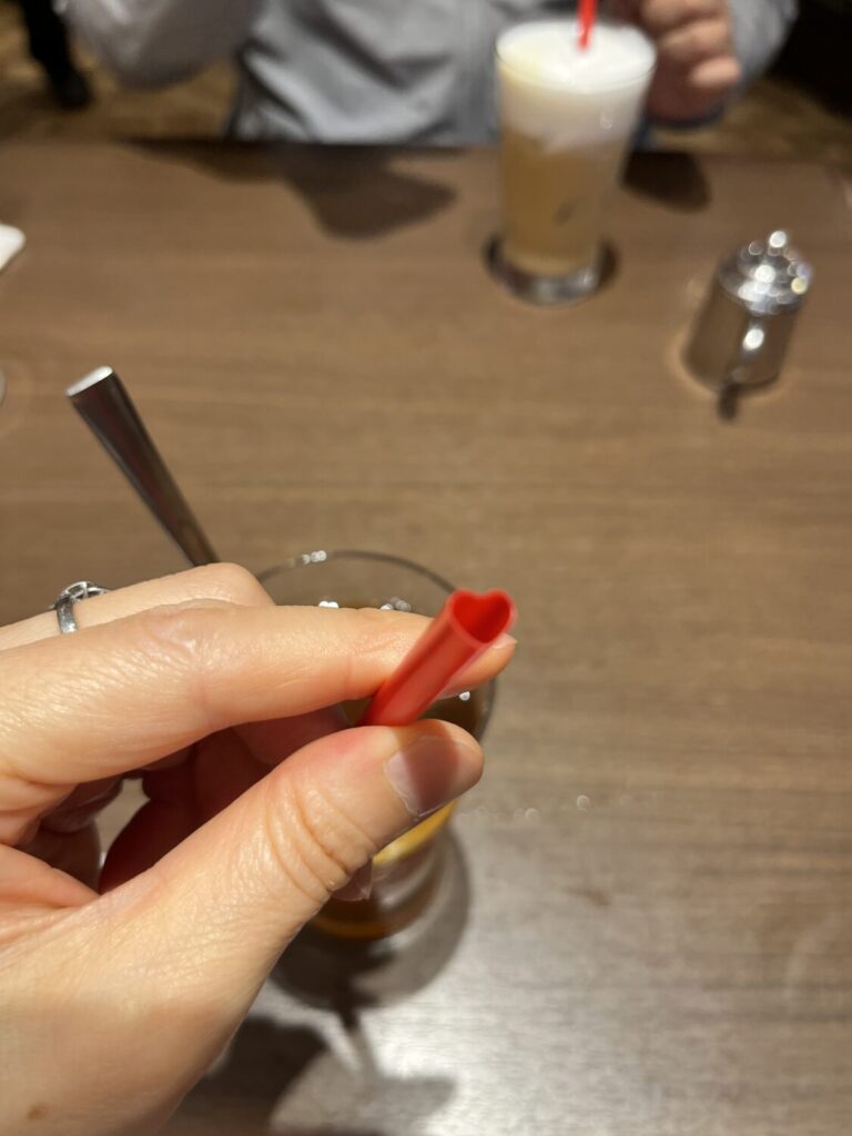 はちみつフルーツティーもフルーツの甘さがはちみつによくあっていて絶品。まるでジュースのような味わいが楽しめるフルーツティーでした。ハートのストローがかわいいですね。ごちそうさまでした。
