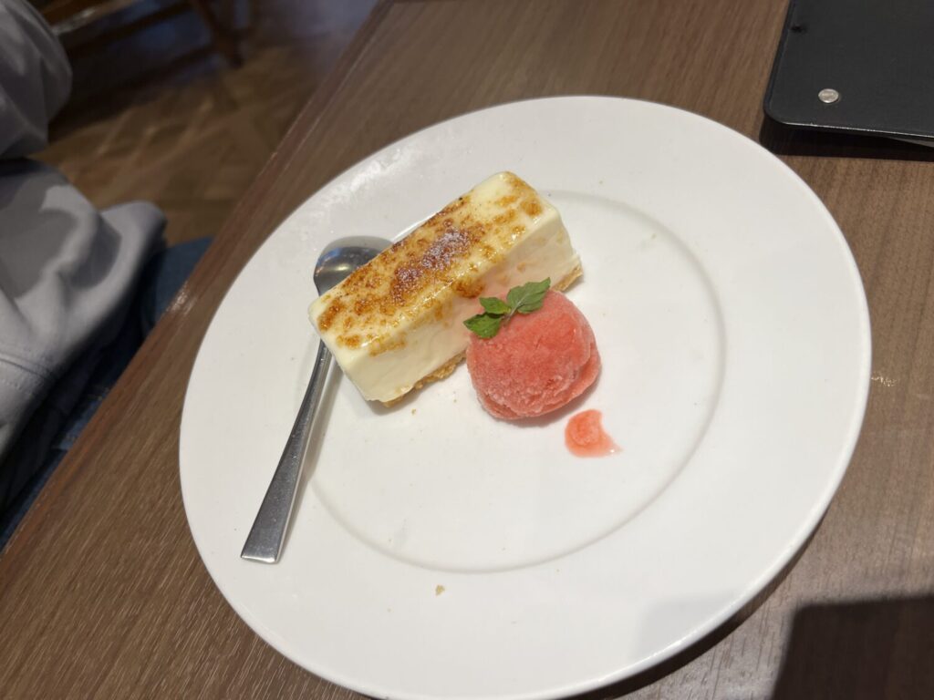 食後にやってきたのがデザート。こちらは炙りチーズケーキ~ラズベリーソルベ添え~。おいしいチーズケーキといった感じでした。ふんわりチーズの味がしておいしかったです。