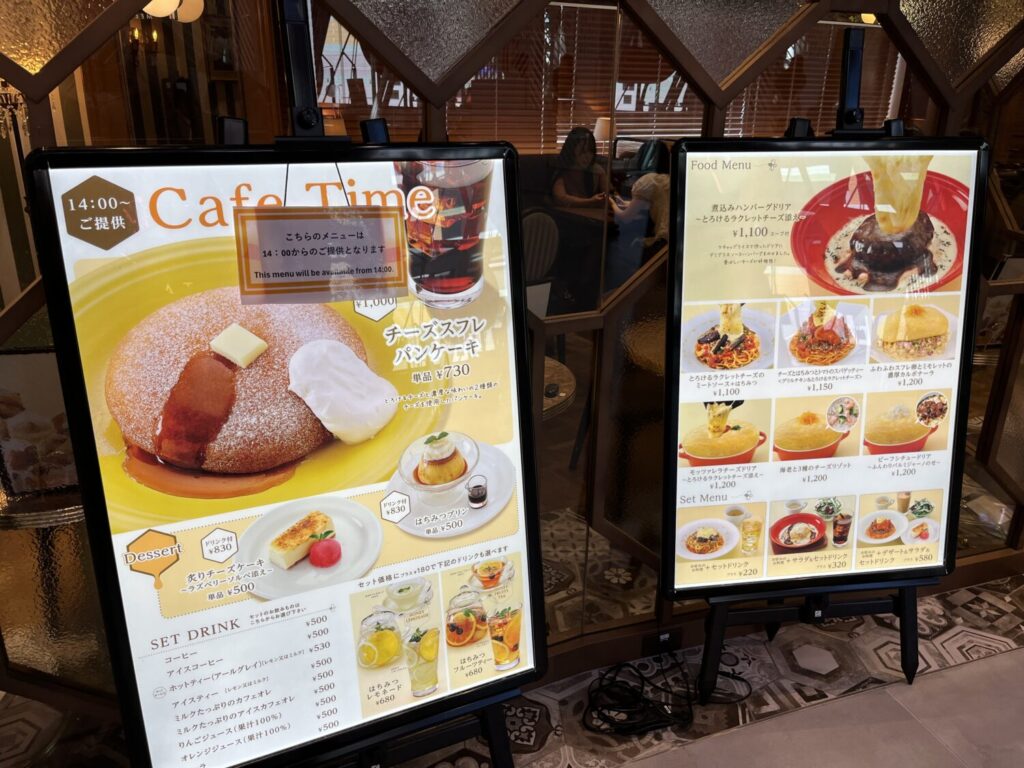 カフェタイムには看板メニューのチーズスフレパンケーキもあるので、梅田で一息つきたいときには是非行ってみてくださいね。