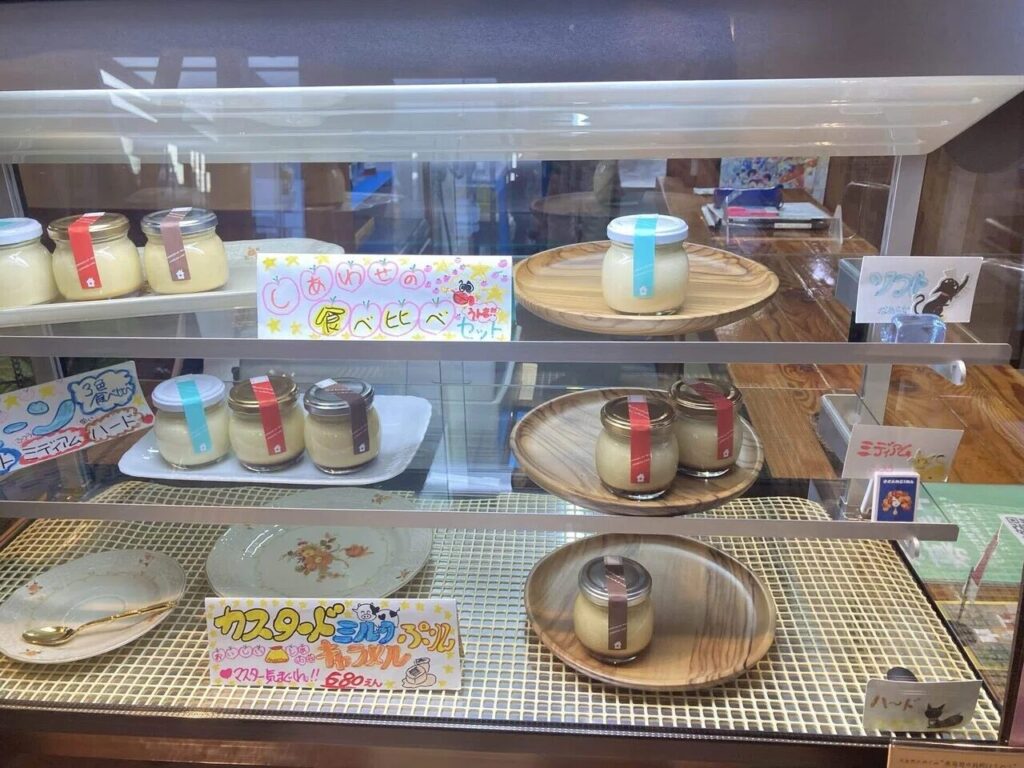 ショーケースの上や壁には、愛情がこもった手書きPOPが並び、プリンの特徴や素材のこだわりがやさしい言葉で紹介されています。