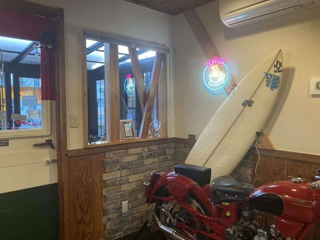 さらに、店主さんの趣味であるバイクやサーフボードが飾られている遊び心あふれる空間で、プリン専門店とは思えないワクワク感があります。
