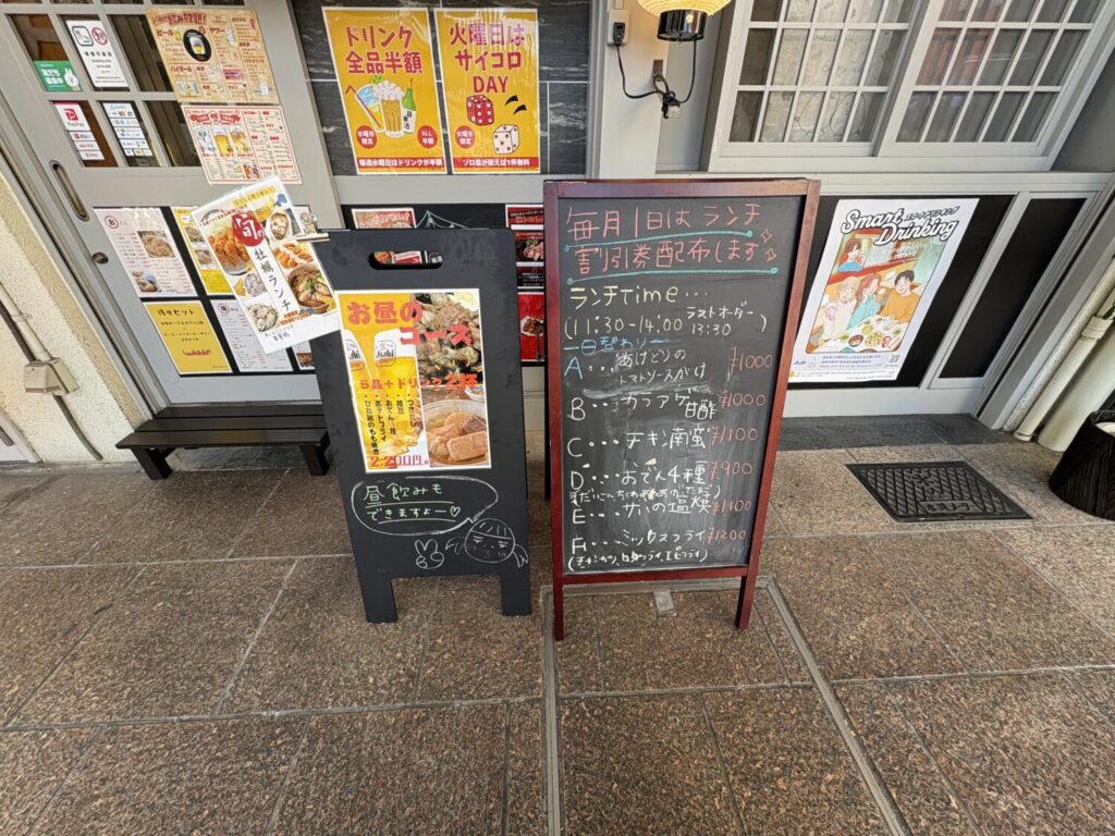 お店の前に立つと、まず目に入るのがランチ内容を書いた黒板。今回オーダーしたチキン南蛮以外にも