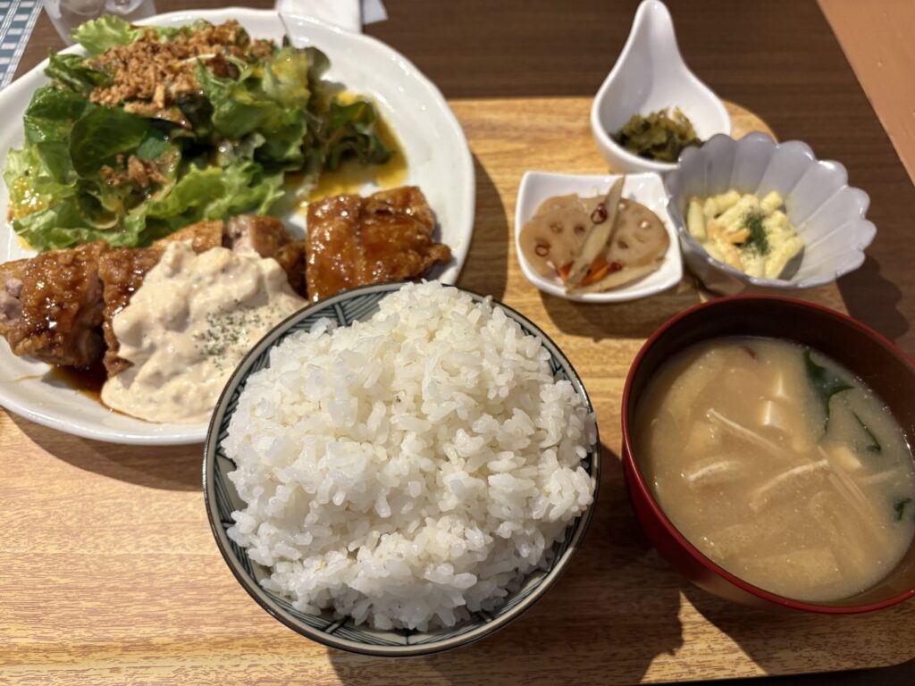 今回いただいたのは、チキン南蛮ランチ(1,100円)。メインのチキン南蛮に、ごはん、味噌汁、そして小鉢が数品付いた定食です。