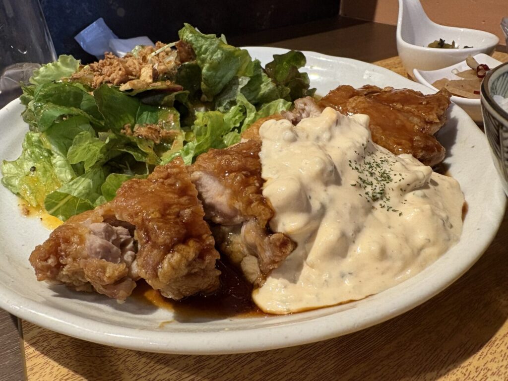 大きめの皿に盛られたチキン南蛮は、見た目からして食べ応え十分。揚げたての鶏肉の上には、自家製のタルタルソースがたっぷりとかかっています。横には葉物野菜を中心としたサラダが添えられ、揚げ物でも重くなりすぎない構成です。