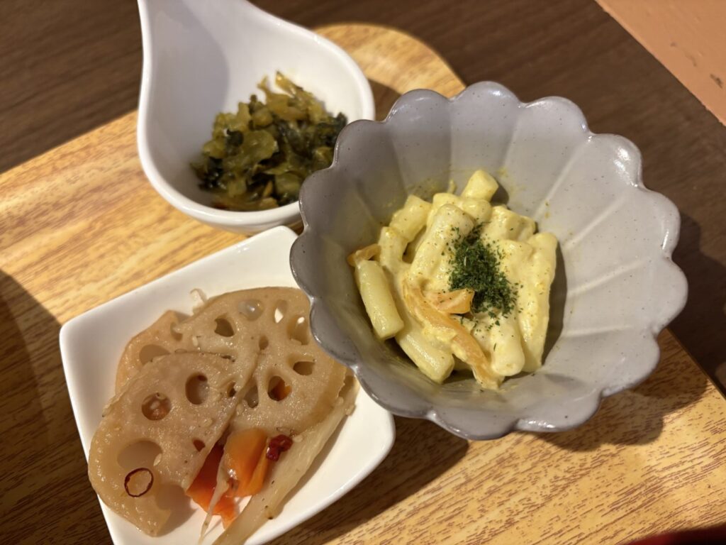 小鉢は日替わりとのことで、この日はれんこんの和え物やマカロニサラダ、漬物など。どれも箸休めとしてちょうどよく、定食全体のバランスを整えてくれます。