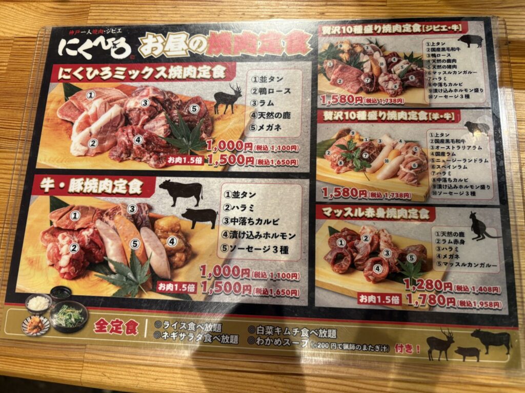 一人焼肉を前提にしたカウンター席、そして牛・豚に加えてジビエまで楽しめるランチ構成。三宮の中でも、少し個性のある存在といえます。