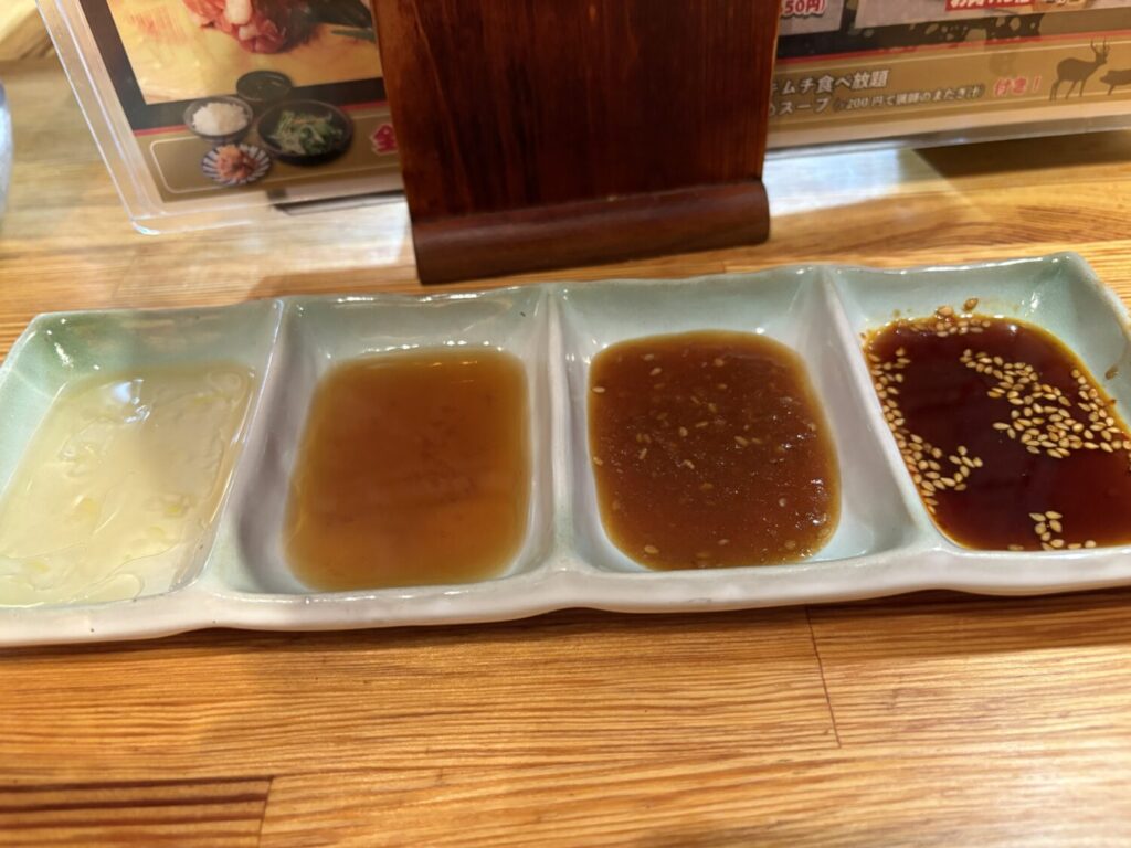 にくひろのランチで印象的だったのが、タレの豊富さです。卓上には、4種類の特製つけダレが用意されており、どれも役割がはっきりしています。