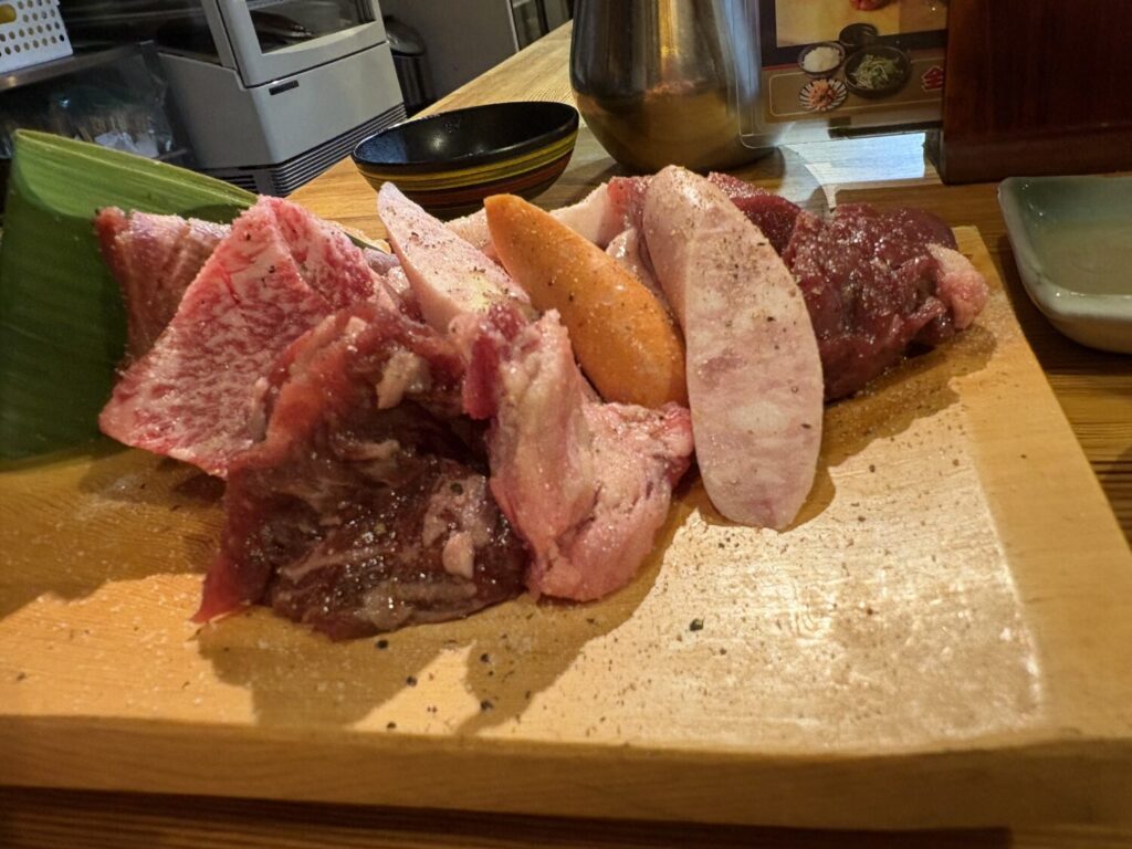 木のプレートに並んだ肉を見た瞬間、まず種類の多さに目を引かれます。内容は以下の10種。
