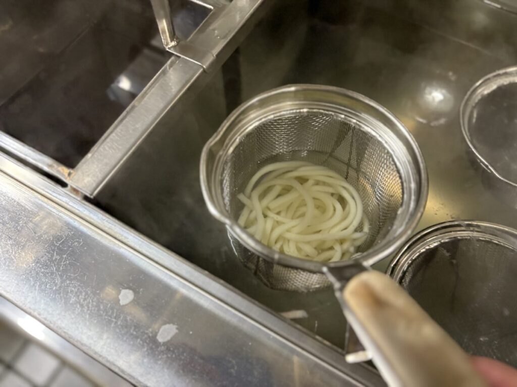 麺を受け取ったら、すぐ隣にあるお湯の張られた釜へ。