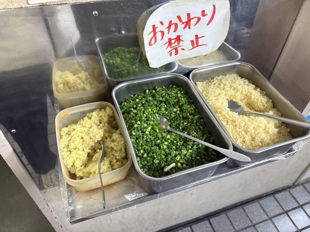 続いて薬味コーナーへ。ネギ、天かす、ショウガが並び、こちらもセルフで自由に調整できます。