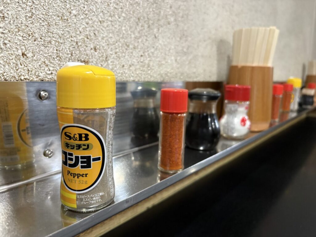席に着くと、卓上には一味唐辛子、コショー、味の素などの調味料が用意されています。