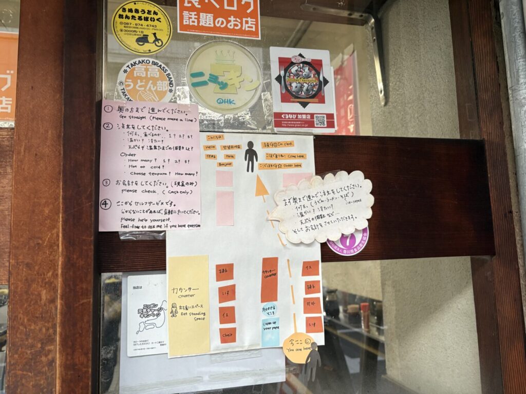 セルフうどんに不慣れな人でも、壁やガラス戸に貼られた案内を見れば、次に何をすればよいかが理解できるよう工夫されています。