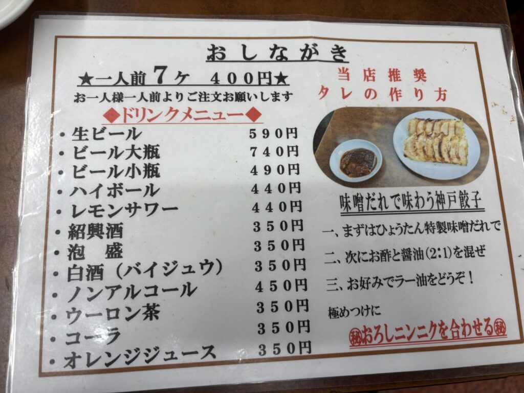 ドリンク類も、ビールやハイボール、酎ハイ、日本酒など、餃子と相性の良いものが揃っています。価格帯も明確で、気負わず注文できる点も、長年親しまれてきた理由のひとつでしょう。