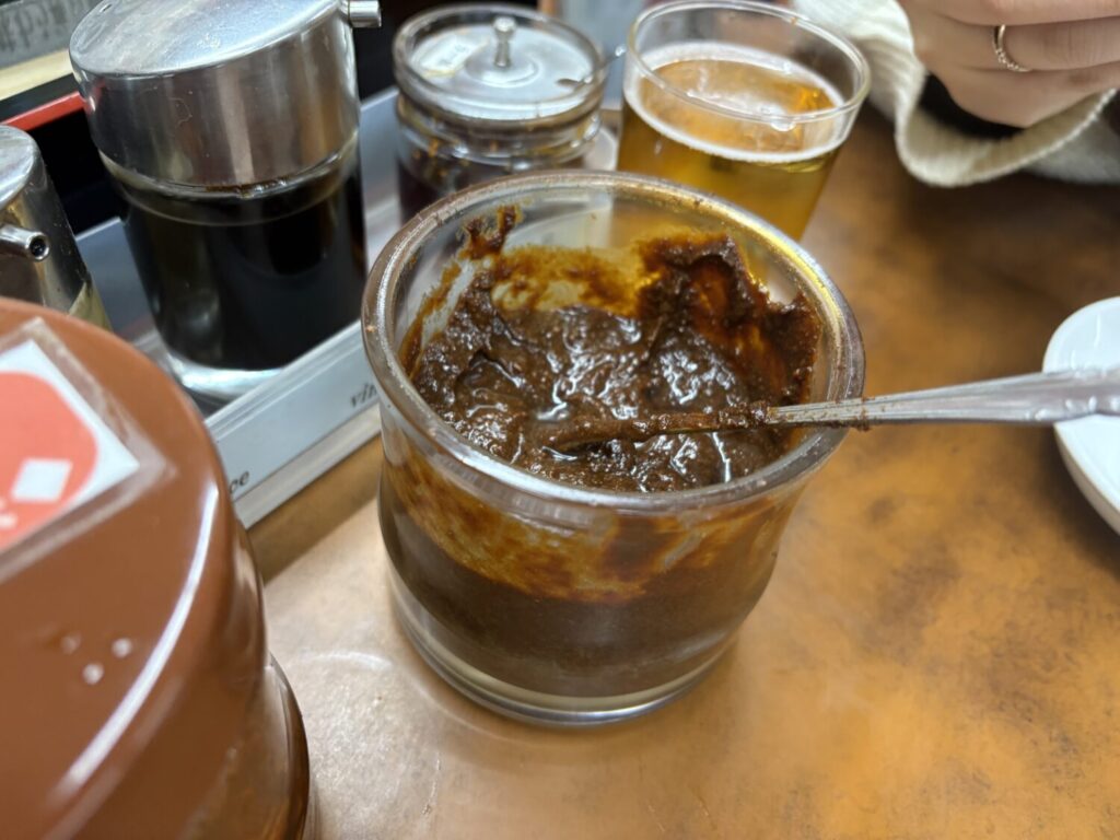 ここで欠かせないのが、赤味噌をベースにしたオリジナルブレンドの味噌ダレ。まずは何も足さず、ひょうたん特製の味噌ダレだけで味わいます。コクがありながらも後味はすっきりしており、餃子そのものの味を引き立ててくれます。