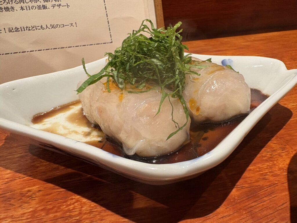 次にいただいたのが、「もちもち海老の蒸し春巻き」。