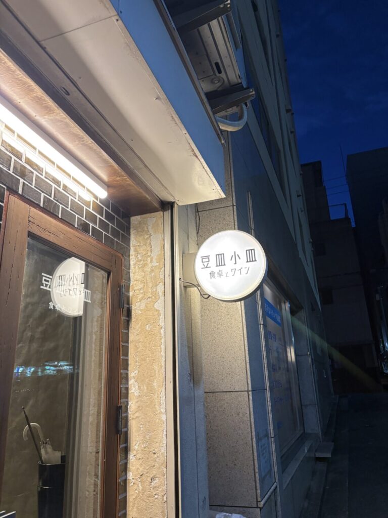 三ノ宮の街を少し歩き、通りの明かりが落ち着き始めた頃。白くやわらかな灯りを放つ丸い看板が目に入ります。そこに記されたのは「豆皿小皿 食卓とワイン」という、どこか家庭的で、同時にワインへの期待も膨らむ名前。