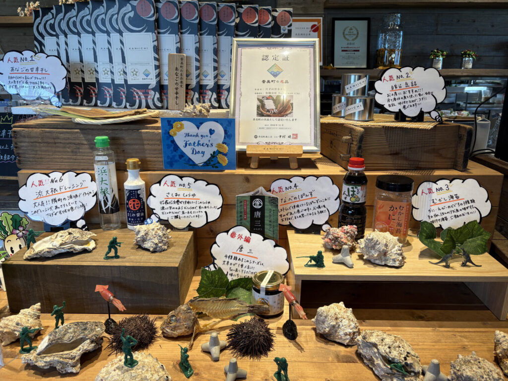 店内に並ぶ干物や加工品、掲示された情報からも、香住の魚を正しく伝えたいという意図が感じられました。