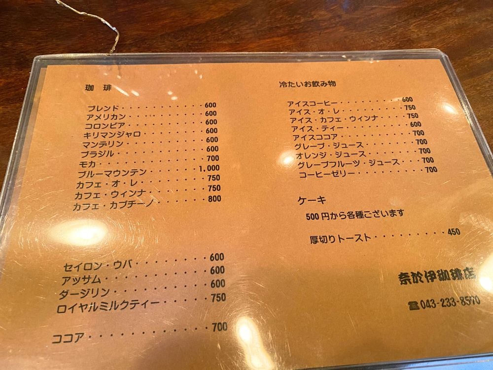 奈於伊珈琲店のメニューはコーヒーをはじめ、軽食やケーキなどが用意されています。