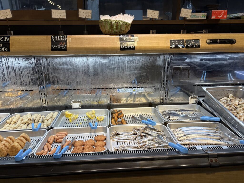 また、ウインナー、つくね、とうもろこしといった食材も用意されています。魚介が苦手な人や子ども連れでも選びやすく、家族やグループでも無理なく楽しめる構成です。