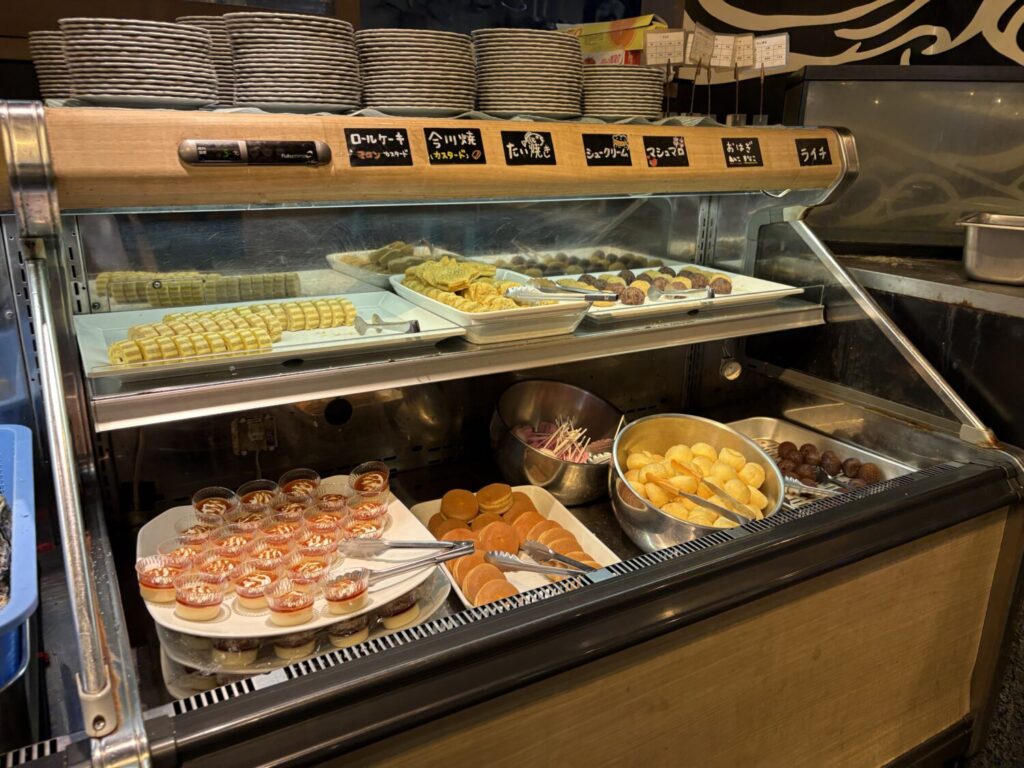 さらに、ロールケーキや今川焼、シュークリーム、マシュマロ、ライチといったスイーツも充実。