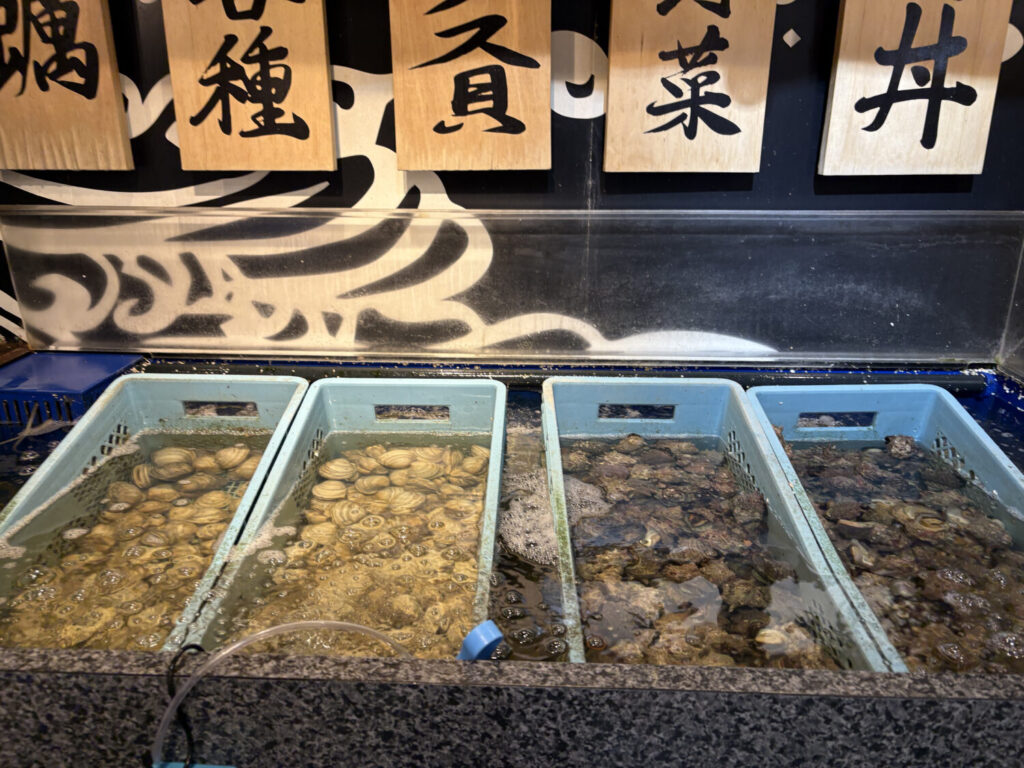 これらの貝は、すべて自分で取るスタイル。トングを使って生け簀から取り出し、そのままトレーに乗せて席へ運びます。