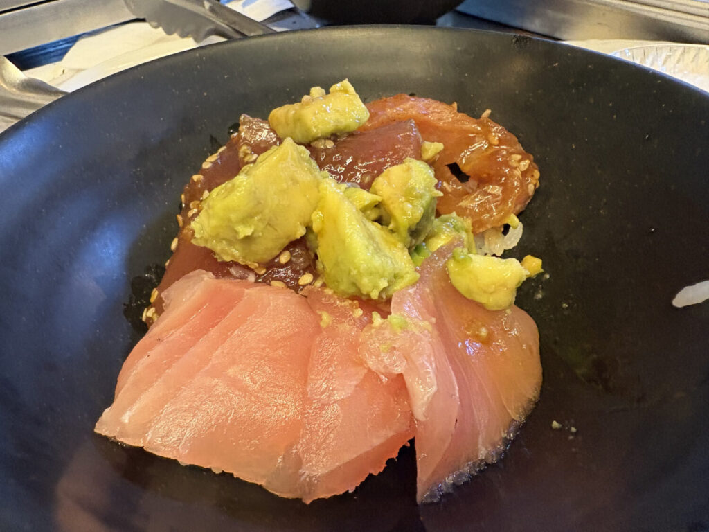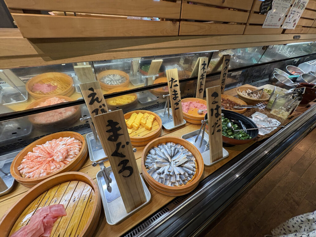 まぐろ、ネギトロ、まぐろユッケ、エビ、コハダ、かれい、イカなど、種類は豊富。こちらも浜焼きと同様、セルフ形式です。