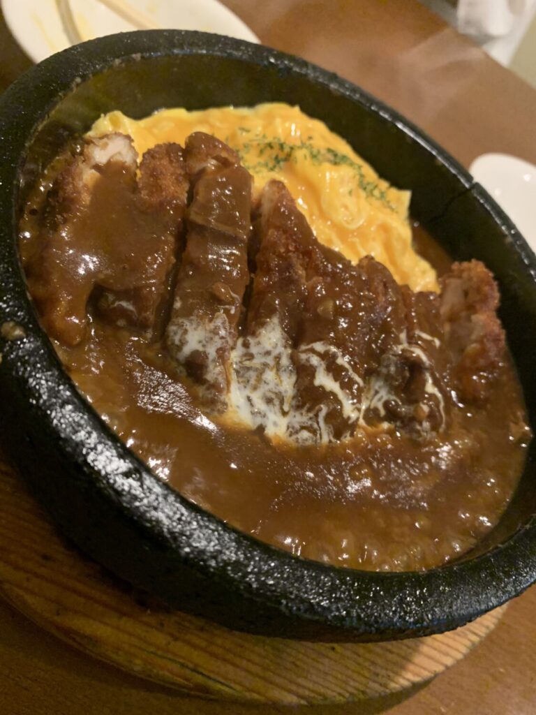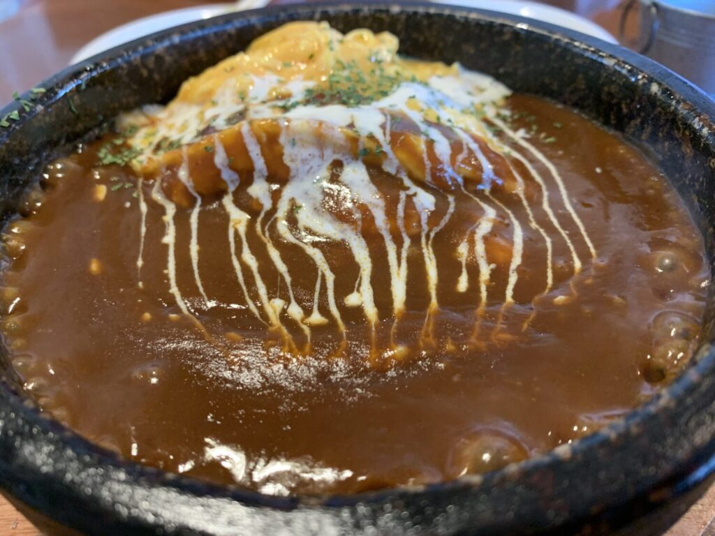チキンカツをのせた石焼オムライスは、見た目以上に計算された組み合わせ。