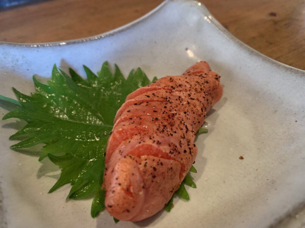表面を香ばしく炙った明太子は、プチプチとした食感に胡椒の効いた味付け。