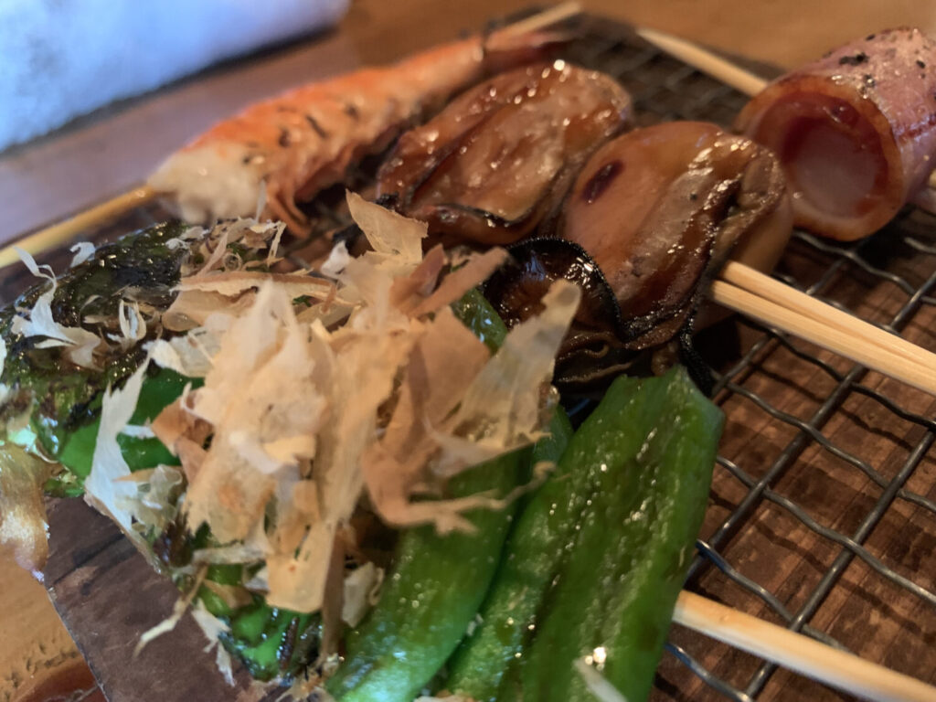 この日注文したのは、エビ、きすの大葉はさみ焼き、万願寺とうがらし、牡蠣、うずらベーコン。