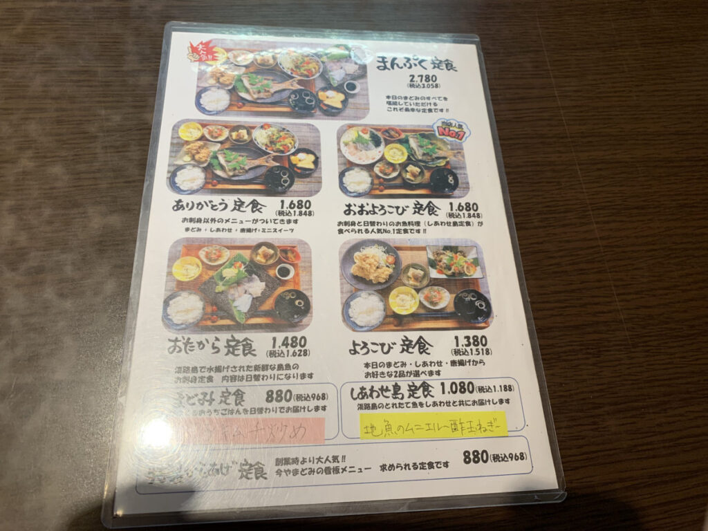 島の魚と手づくりおかずが並ぶ定食中心のメニュー構成