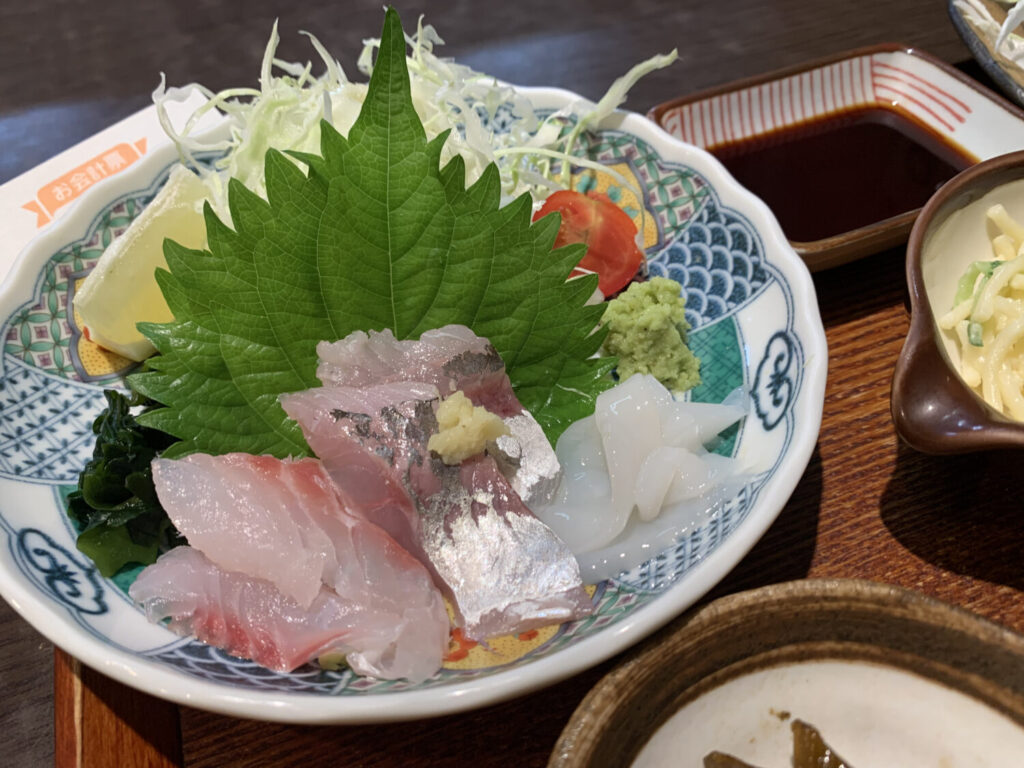 この日の刺し身は、アジ、鯛、イカ。