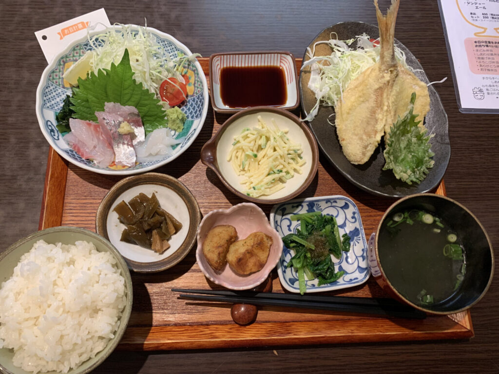 刺し身と日替わりの主菜がセットになった、まどみらしさが詰まった内容です。