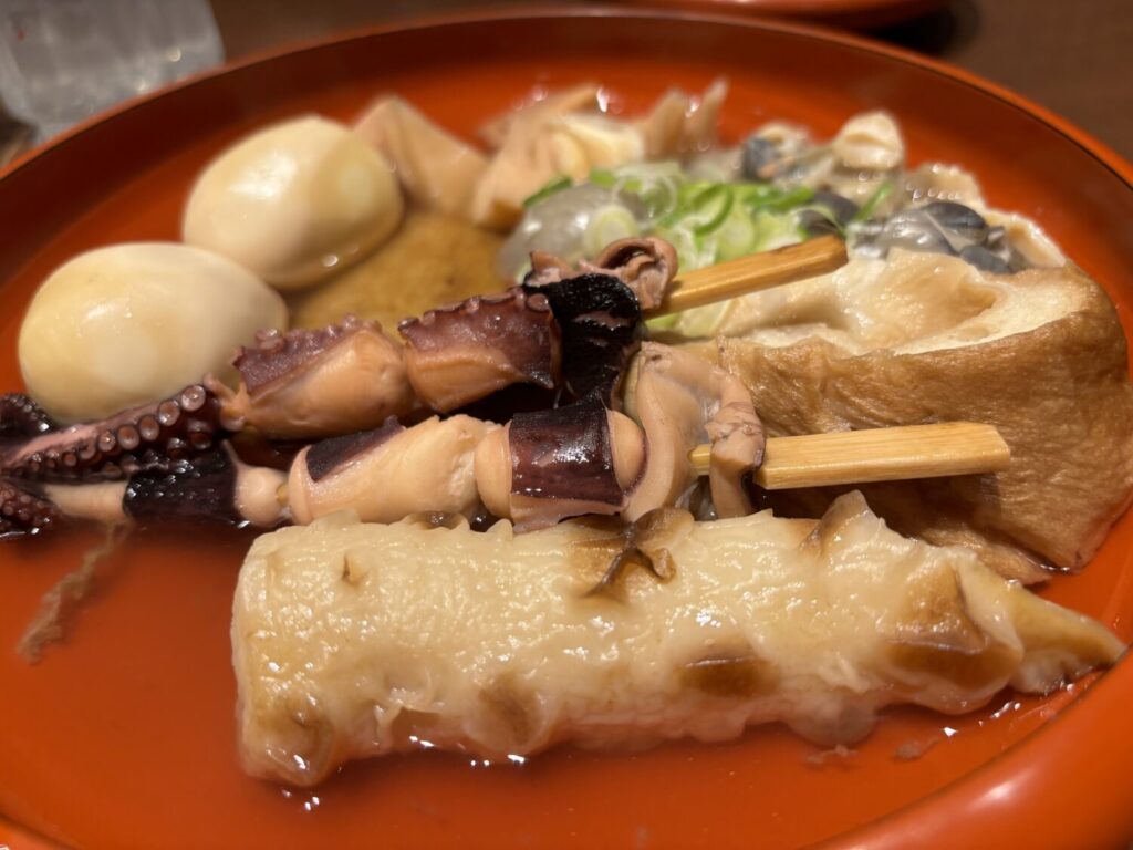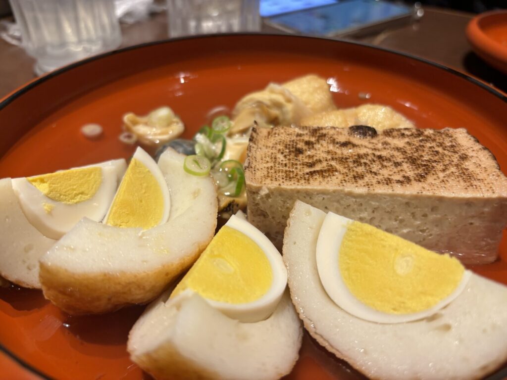 存在感があったのが焼き豆腐とあぶらあげ。表面には軽い香ばしさがありながら、中は出汁をたっぷり含んでいて、噛むとじゅわっと旨みが広がります。油分は重たく感じず、むしろ出汁の輪郭をはっきりさせるような役回り。金沢おでんが「出汁を食べる料理」だということを、あらためて実感させてくれました。
