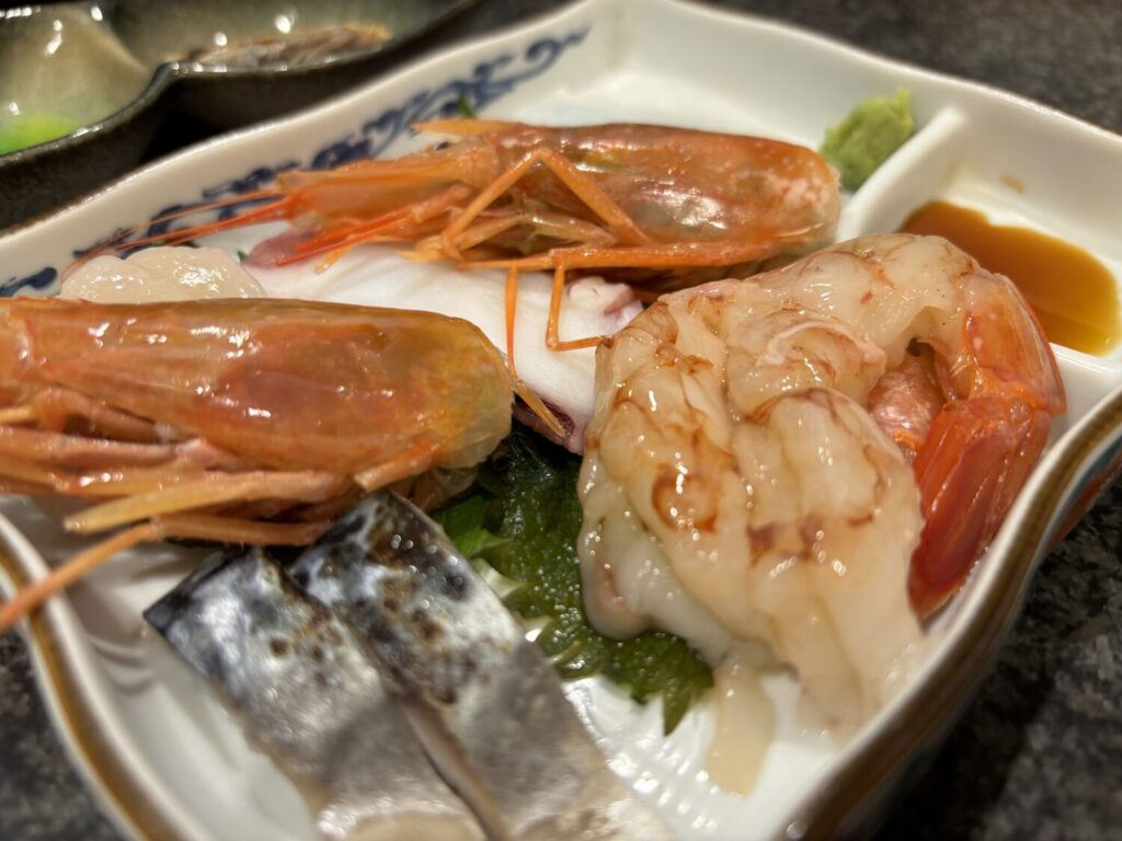 コースはまずエビの刺し身から