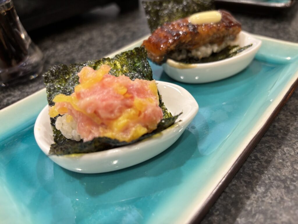 エビの刺し身に続いて運ばれてくるのが、とろたく寿司とうなぎバター寿司です。
