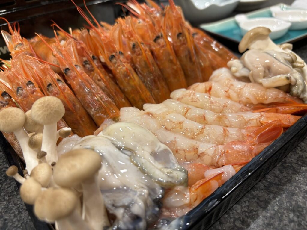 「元祖濃厚エビカキしゃぶしゃぶコース」はどれを食べても美味しいですが、特に印象に残ったのは、やはり1kgのエビと牡蠣を主役にしたしゃぶしゃぶでした。