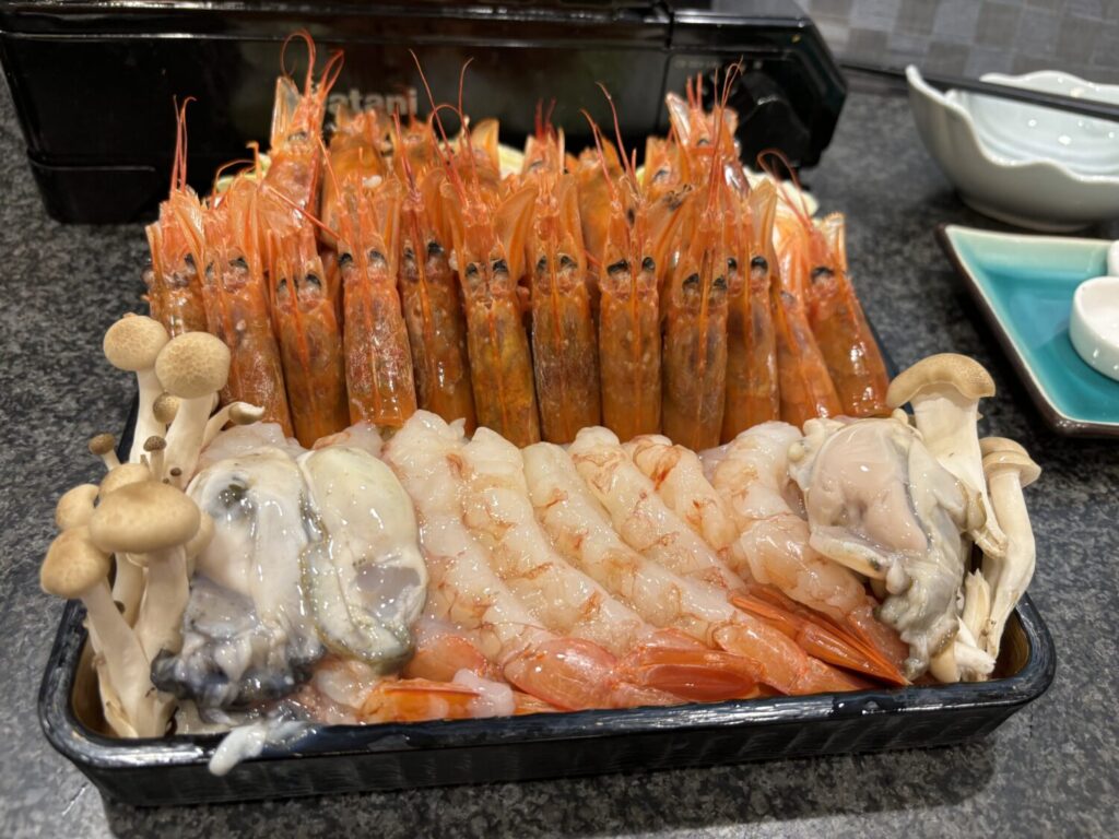 寿司を食べ終えると、いよいよメインの鍋が運ばれてきます。ここで店員さんから声をかけられ、「先に写真をどうぞ」。器いっぱいに盛られたエビとカキは、まさに圧巻です。