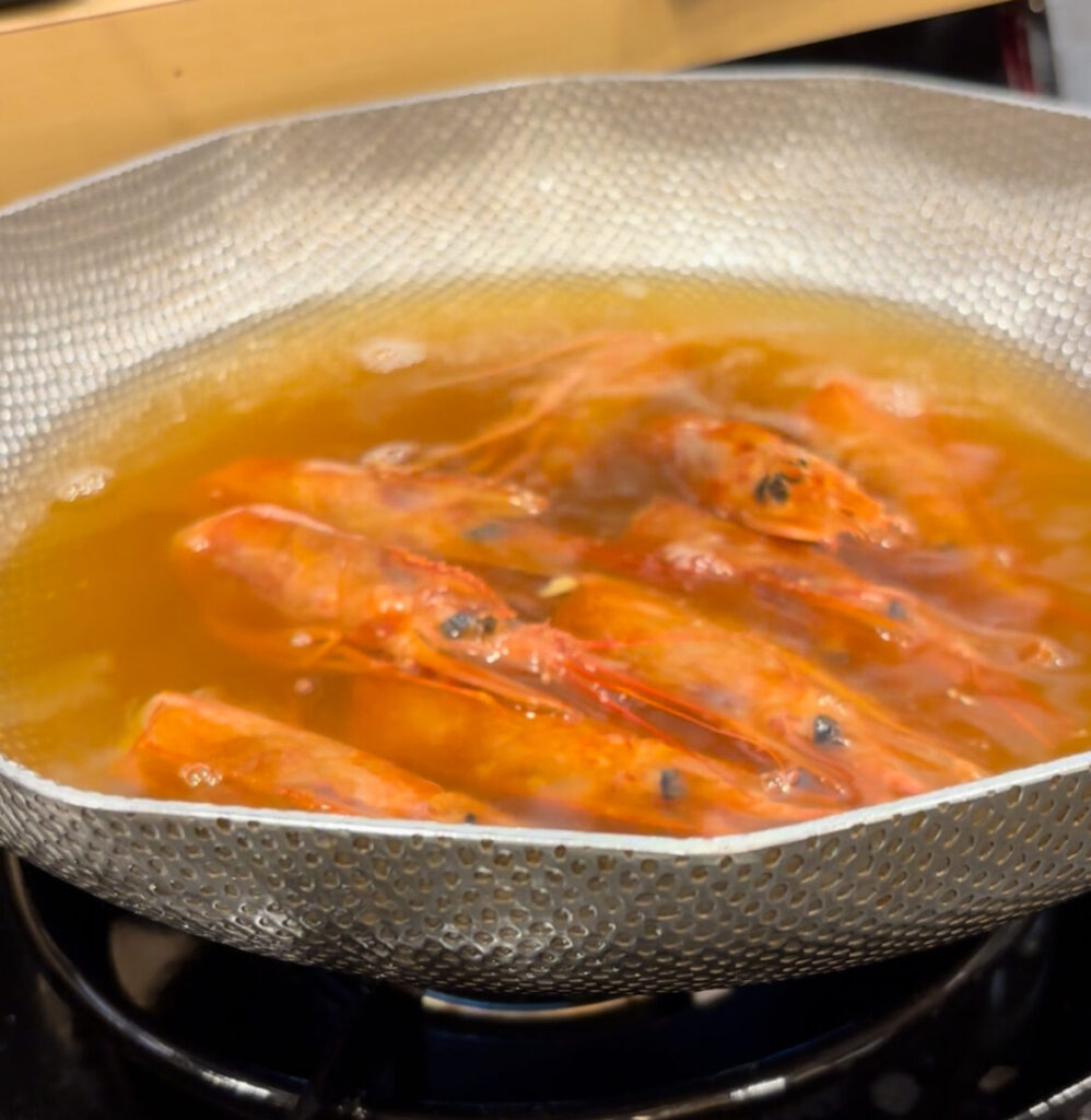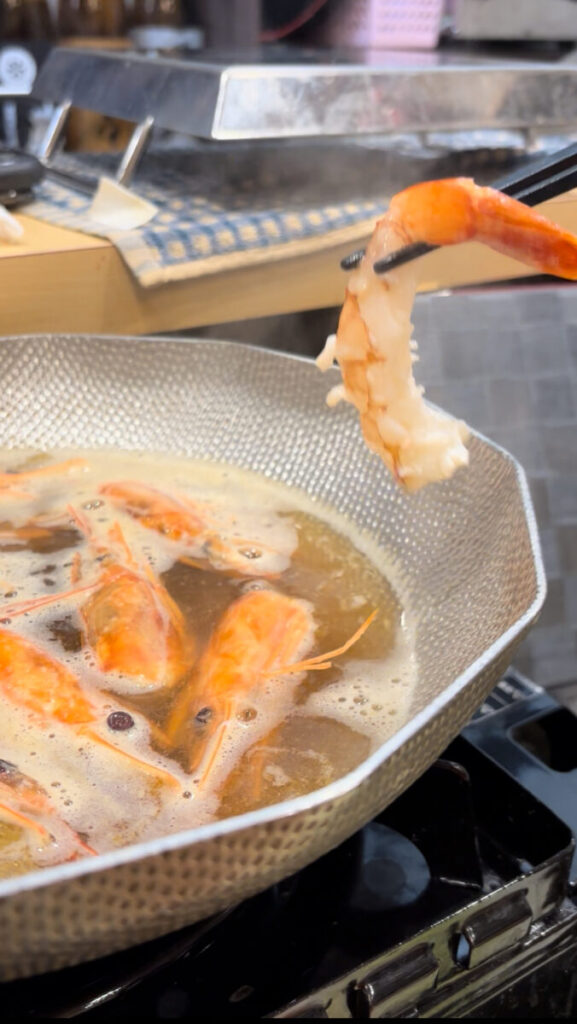 写真撮影が終わると、店員さんが鍋の準備を始めます。まず鍋に入れるのはエビの頭。殻ごと火にかけることで、甲殻類ならではの旨みがじわじわと溶け出し、鍋のベースとなる出汁が完成していきます。湯気とともに立ち上る香りだけで、食欲が一気に刺激されます。