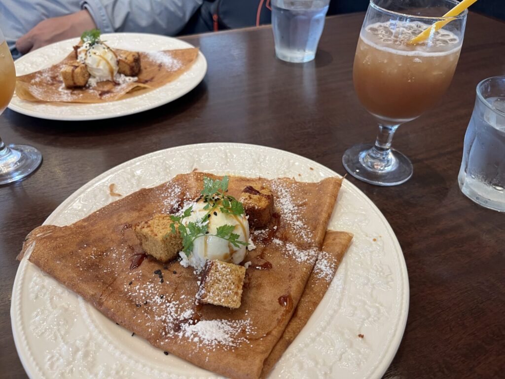 そして、こちらがクレープです。甘い香りがふんわり。それもそのはず。こちらのクレープはフランス産小麦粉・ゲランドの塩・エシレバターを使う本格派。今回のクレープはキャラメルの香ばしさが上に乗ったケーキとマッチしてこれまた大満足でした。