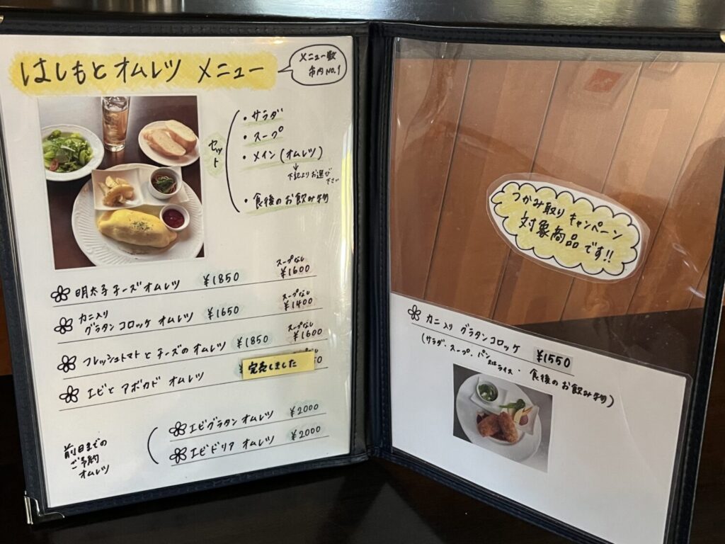 次第にオムレツのレパートリーは増えていき、今では10種類以上。はしもとオムレツ登録店のなかでも、最多のオムレツ数を誇っています。
