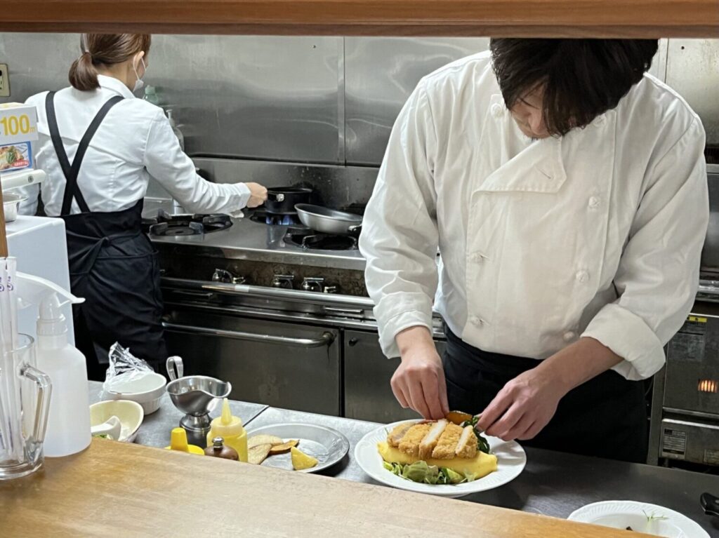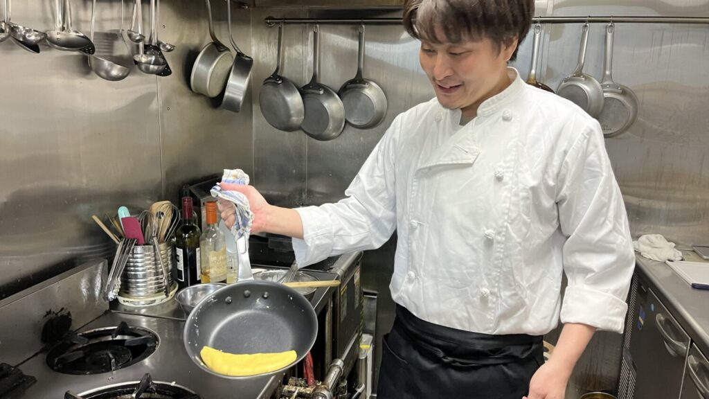 オムレツづくりのこだわりをお聞きすると「生クリームを入れて、ふわとろに仕上げています」と陽介さん。オムレツがぷるぷるっと揺れる瞬間を、誇らしげに見せていただきました。