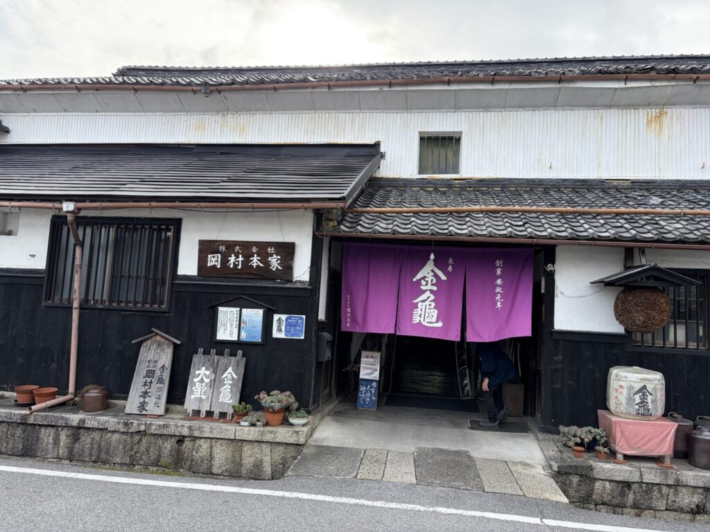 こちらが岡村本家です。のれんに金亀の文字が。それもそのはず、金亀は岡村本家のトレードマーク。岡村本家のお酒の名前にもなっています。